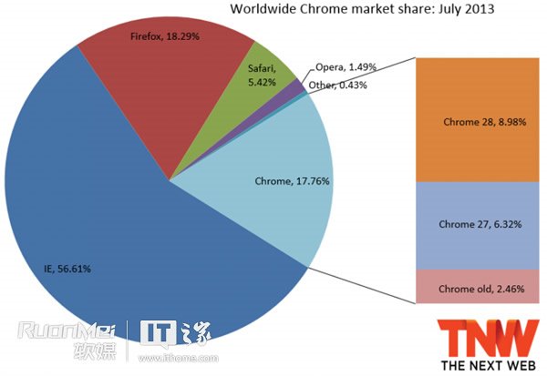 Chrome則是7月份表現(xiàn)最好的瀏覽器,總份額達(dá)到17.76%;剛發(fā)布不久的Chrome 28份額已達(dá)到8.98%。