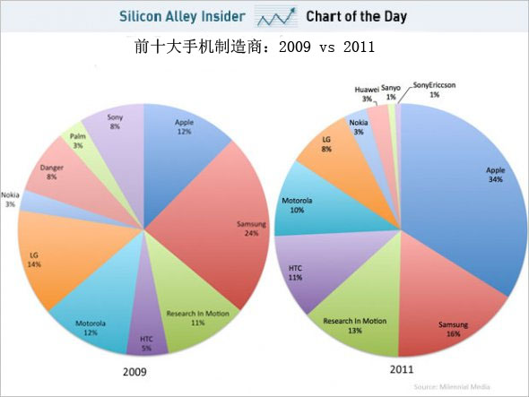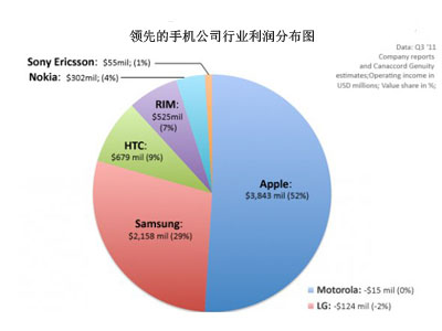 2011年11月7日——利潤(rùn)的比較向我們展現(xiàn)了另外一番景象。蘋果手機(jī)只占了4%的市場(chǎng)卻擁有52%的利潤(rùn)。