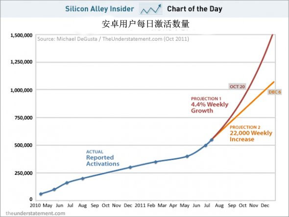 2011年10月3號(hào)——據(jù)預(yù)測(cè),在今年12月,安卓的單日激活量將會(huì)沖擊1百萬(wàn)。這個(gè)數(shù)字很難被超越。