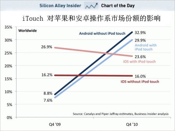 2011年4月4日——即使算上發(fā)展動(dòng)力并不強(qiáng)勁的iPod Touch,安卓也將iOS斬于馬下。