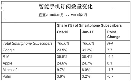 2011年1月——安卓市場(chǎng)份額最終超過(guò)了iPhone。讓我們看一看安卓分了RIM多少羹。