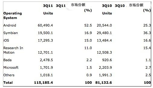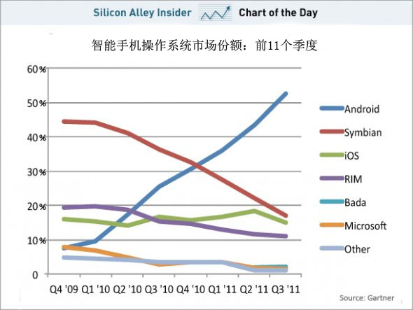 2011年11月15日——從一些數(shù)字來(lái)看,第三季度安卓的市場(chǎng)份額是52.5%,和去年比幾乎翻倍。iOS連年挫敗,到今年的第三季度達(dá)到15%。 該文章在 2013/8/9 9:06:26 編輯過(guò) |