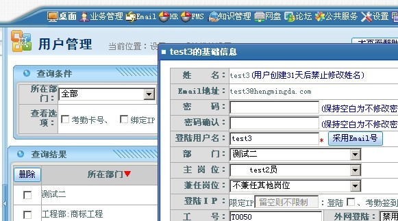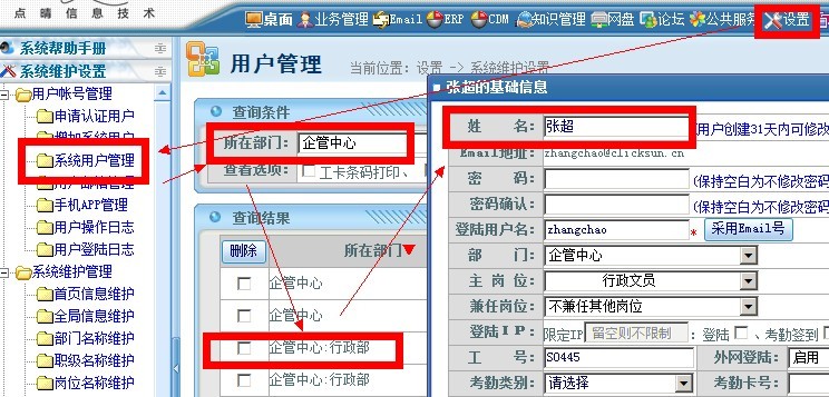 請(qǐng)教下管理員,點(diǎn)晴OA里,怎么帳戶(hù)建立后,不能更改姓名了? 點(diǎn)晴客服5(1919001814) 09:16:19 中文姓名超過(guò)31天才不能改,31天以?xún)?nèi)都可以改。 英文名@單位域名,也即系統(tǒng)中的用戶(hù)Email地址,一經(jīng)錄入,就不允許再更改,是點(diǎn)晴OA中的核心身份識(shí)別信息。如果需要更改用戶(hù)的英文登錄名,在剛剛錄入完畢就發(fā)現(xiàn)錯(cuò)誤了,如果該用戶(hù)還未登錄產(chǎn)生系統(tǒng)操作日志,就可以在系統(tǒng)用戶(hù)賬戶(hù)管理-》系統(tǒng)用戶(hù)管理中,找到這個(gè)用戶(hù)直接刪除后重新創(chuàng)建新賬號(hào);如果這個(gè)用戶(hù)已經(jīng)用這個(gè)用戶(hù)登錄并產(chǎn)生了系統(tǒng)操作日志,那就不允許刪除這個(gè)賬號(hào),而只能作廢這個(gè)賬號(hào),然后再重新注冊(cè)一個(gè)新用戶(hù)。