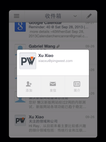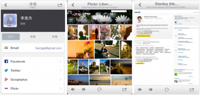 當(dāng)然,電子郵件后綴的意義還不僅如此,由于幾乎所有的網(wǎng)絡(luò)服務(wù)賬戶系統(tǒng)都會提供郵箱注冊的方式并被廣泛使用,所以它實際上就是一個個人的網(wǎng)絡(luò)ID。于是谷祖林想到,只要用戶使用了相應(yīng)的郵箱賬戶注冊了linkedIn、Flickr、Google+、Twitter等網(wǎng)站,那么Seed Mail會為他們自動匹配這些信息來補全其個人資料,點擊它們就能打開所對應(yīng)的個人頁面。 谷祖林告訴我,不少人的工作郵箱和注冊互聯(lián)網(wǎng)服務(wù)的郵箱不同,但只要他們在互聯(lián)網(wǎng)服務(wù)中填寫了對應(yīng)的聯(lián)系郵箱,Seed Mail就能找到它們并進(jìn)行匹配。例如,我用chencanran@gmail.com注冊了linkedIn,并在個人聯(lián)系方式中寫上了工作郵箱rchen@pingwest.com,那么,在Seed Mail上通過PingWest郵箱加我為聯(lián)系人的用戶,也能找到我的linkedIn頁面。