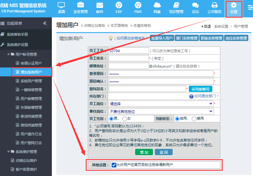 1、管理員登陸系統(tǒng),勾選“允許員工在首頁(yè)自助申請(qǐng)新用戶”: