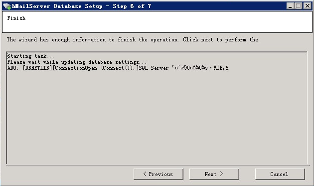 如果上面數(shù)據(jù)庫(kù)服務(wù)器地址、數(shù)據(jù)庫(kù)訪問(wèn)用戶(hù)名、密碼配置錯(cuò)誤的話,會(huì)出現(xiàn)以下界面: ![]() 如果確定數(shù)據(jù)庫(kù)訪問(wèn)用戶(hù)名和密碼無(wú)誤,那就是數(shù)據(jù)庫(kù)服務(wù)器地址有誤造成的,按照這個(gè)帖子試試:hMailServer Database Setup—Step 6 of 7 一定要配置正確后,才能進(jìn)行下一步動(dòng)作。