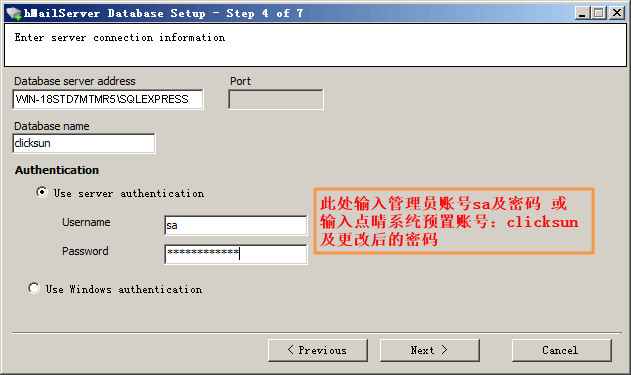 點(diǎn)擊:windows系統(tǒng)-》開(kāi)始-》所有程序-》hmailserver-》hMailServer Database Setup,在彈出的對(duì)話框中輸入默認(rèn)管理密碼“clicksun2010”,進(jìn)入后按照以下步驟操作: