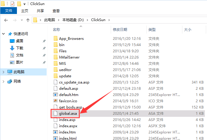 如果實(shí)在還是不知道本機(jī)的數(shù)據(jù)庫(kù)地址(服務(wù)器名稱(chēng))、用戶(hù)名、密碼,還有另外一個(gè)方法,用記事本打開(kāi)OA服務(wù)器點(diǎn)晴OA安裝根目錄下的文件:D:\clicksun\global.asa,在里面就可以看到上面幾個(gè)參數(shù)了: