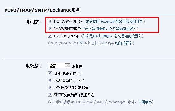 如何打開POP3/SMTP/IMAP功能?為了保障用戶郵箱的安全,QQ郵箱設(shè)置了POP3/SMTP/IMAP的開關(guān)。系統(tǒng)缺省設(shè)置是“關(guān)閉”,在用戶需要這些功能時(shí)請(qǐng)“開啟”。 首先,登錄郵箱,進(jìn)入設(shè)置-帳戶; ![]() 然后,在“帳戶”設(shè)置中,找到設(shè)置項(xiàng),進(jìn)行設(shè)置,如下: ![]() 最后,保存設(shè)置,即打開了相應(yīng)的服務(wù)。 該文章在 2014/4/11 10:34:16 編輯過 |