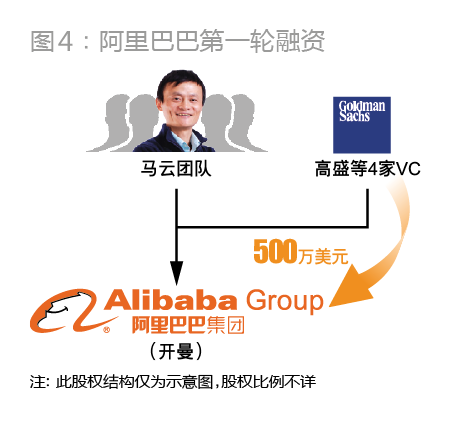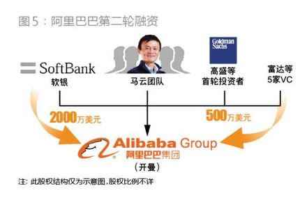 在相當長的一段時間里,馬云“當政”的阿里帝國,有兩位舉足輕重的“議員”先后牽制著他—軟銀與雅虎。馬云所引進的這兩大股東,在成就阿里帝國的同時,也令馬云日后陷入無限的糾結之中。 軟銀——早期金主 與早期中國互聯(lián)網(wǎng)創(chuàng)始人要么是海歸IT精英要么是本土IT極客不同的是,英語教師出身的馬云對IT技術基本是門外漢。創(chuàng)業(yè)初期,馬云帶著“十八羅漢”窩在杭州湖畔花園他那套150平方米住家兼辦公的房子里,靠著大家七拼八湊而來的50萬元啟動資金,憧憬著“要做一件偉大的事情”。 那時候的馬云團隊被稱為“三無團隊”—一無顯赫出身,二無成功案例,三無技術優(yōu)勢,這種團隊背景是難入投資人法眼的。馬云回憶:“我記得 1999年到硅谷尋找資金,跟很多風投、資本家接洽,但是沒有人有興趣投資阿里巴巴,我被一一回拒?!?/p> 直到華爾街背景的蔡崇信于1999年5月加盟阿里出任CFO之后,阿里的融資才有起色。 1999年10月,在蔡崇信的牽線下,由高盛牽頭,聯(lián)合蔡的原東家Investor AB公司以及新加坡政府科技發(fā)展基金等VC,共同向阿里巴巴投資500萬美元(圖4)。拿到融資之后,資金稍顯寬裕的阿里巴巴終于告別了馬云自住的居民樓,搬到了寫字樓華星大廈辦公。