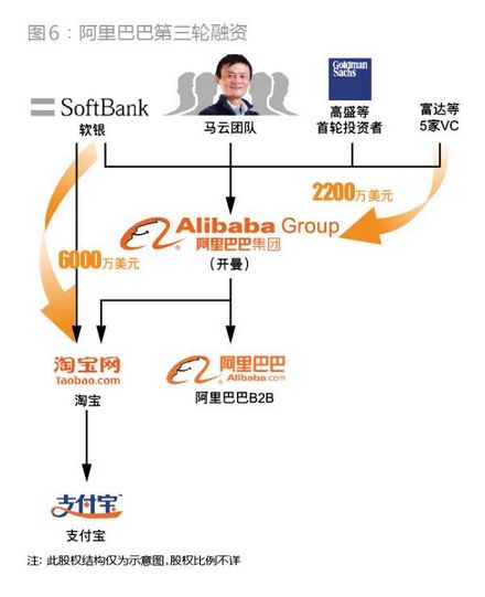 2003年下半年,阿里巴巴再次獲得軟銀聯(lián)合富達投資、寰慧投資和TDF合計8200萬美元的投資。此次融資的背景是,eBay收購易趣網(wǎng)登陸中國本土,并控制了C2C市場80%的份額,對阿里形成大兵壓境之勢,為了應對eBay,阿里以攻為守推出淘寶網(wǎng)。8200萬美元的融資中,軟銀的6000萬美元便是單獨注資給淘寶網(wǎng)的,而且它成了淘寶的大股東(圖6)。