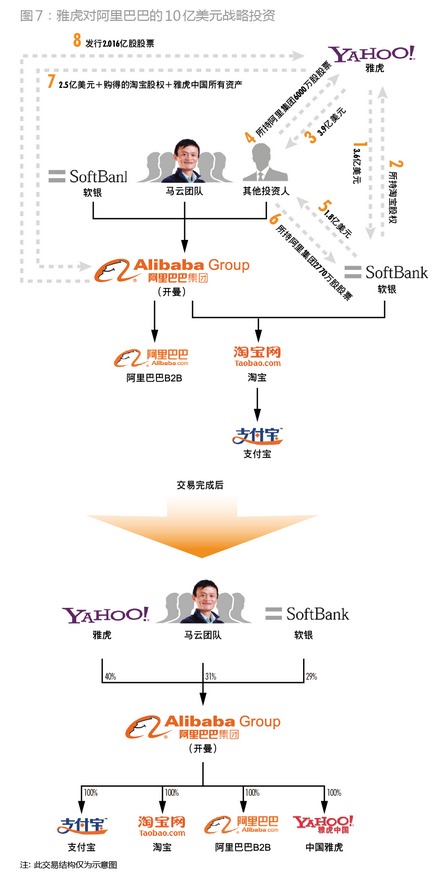 雅虎——eBay逼宮下的入局者 進入2005年,淘寶與eBay之間經(jīng)過兩年的燒錢大戰(zhàn)仍不見勝負,雙方難分難解的較量勢必要繼續(xù)進行下去,而兩年前淘寶從軟銀處斬獲的6000萬美元幾近耗盡,因而急需再次輸血。 所謂屋漏偏逢連夜雨,此時馬云面臨的煩惱遠不止于此。 其一,在中國互聯(lián)網(wǎng)界向來令人生畏的騰訊,居然裹挾著拍拍網(wǎng)殺將進來加入C2C戰(zhàn)局,而且也跟淘寶一樣打著免費的旗號,這意味著淘寶不得不同時面對兩個強敵。 其二,這邊廂淘寶已經(jīng)很缺資金了,那邊廂阿里巴巴的前幾輪風險投資人遲遲等不到阿里的上市,已經(jīng)急不可耐要求套現(xiàn)退出,畢竟自1999年持有阿里股權算起已經(jīng)過去四五年時間了。馬云不得不想辦法為他們找到股權接盤者。 其三,eBay正在打著新算盤,所謂殺敵一千自損八百,它不愿意再與淘寶繼續(xù)惡戰(zhàn)下去,因而向孫正義拋出橄欖枝,謀求收購淘寶進而一統(tǒng)中國C2C市場的江山。而且eBay開出的價錢是令人難以拒絕的10億美元,孫正義對這個價動了心。 面對接踵而來的難題,特別是eBay明確提出收購的逼宮,馬云徹夜難眠。他不知道孫正義面對eBay的收購要約最終會做出什么決定,但他深知孫正義的本性,只要利益足夠,一切都可以談。因而他很難阻止孫正義將股份賣給eBay。 如果eBay真的實現(xiàn)對淘寶甚至阿里巴巴的收購,那對馬云來說絕對是個災難。因為,以eBay首席執(zhí)行官惠特曼的強勢性格,絕不可能讓馬云隨心所欲地掌控企業(yè),雙方之間的控制權之爭將不可避免。馬云的這種擔心不是沒有緣由的,因為自eBay收購易趣,易趣創(chuàng)始人邵亦波就失去了對企業(yè)的話語權。 因而,對企業(yè)控制權異常在乎的馬云,必然強烈抵制eBay的收購動議。這次孫正義似乎并不愿遷就馬云,畢竟這是一個不錯的價格。于是,二人最后只能相互妥協(xié),找一個eBay之外的接盤者,既能滿足孫正義及其他前幾輪投資人的套現(xiàn)需求,又使馬云不至于失去對企業(yè)的控制權,而且還能額外再向阿里投資以解決淘寶的后續(xù)發(fā)展資金。 能符合以上條件的接盤者,似乎只有類似于eBay那樣的互聯(lián)網(wǎng)跨國巨頭,于是在孫正義的撮合之下,雅虎得以入局阿里巴巴。 2005年8月,馬云、楊致遠、孫正義三人的一場“桃園三結義”,令雅虎得以入局,前者以10億美元現(xiàn)金外加雅虎中國的所有資產(chǎn),換取阿里集團40%的股權。 雅虎與阿里集團的這場交易,復雜程度在中國互聯(lián)網(wǎng)界堪稱“空前”。這場交易的全貌實際由四筆交易組合而成(圖7)。