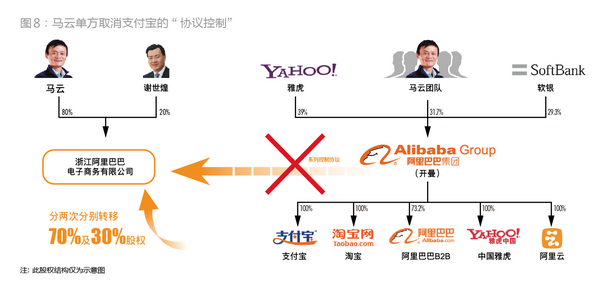 出乎外界意料的是,2011年5-6月,雅虎與馬云管理層之間爆發(fā)了最為嚴重的沖突。 2011年5月10日,當時身為阿里集團大股東的雅虎發(fā)布公告稱:馬云將支付寶從阿里集團轉移到了馬云與謝世煌(阿里創(chuàng)始人之一)二人設立的“浙江阿里巴巴電子商務有限公司”(馬和謝各占股80%和20%),而作為阿里集團大股東的雅虎,對于馬云轉移支付寶的行為毫不知情。消息爆出,雅虎股價應聲下跌7.3%。 雅虎公告的言外之意是,馬云轉移支付寶并未獲得阿里集團董事會的授權許可,因為代表雅虎的董事會成員楊致遠對此事并不知情。這在華爾街看來,是嚴重違背公司治理規(guī)則的。 而且,雅虎聲稱支付寶轉讓的價格僅為3.3億元,遠低于彼時支付寶的實際價值。 于是雅虎與馬云之間上演了一場“國際輿論戰(zhàn)”,雅虎抨擊馬云是在自己不知情的情況下“竊取”了支付寶,而馬云則回應說“不完美,但唯一正確”。他所說的“不完美”指的是單方面取消了阿里集團與支付寶之間的“協(xié)議控制”有違約之嫌;而“唯一正確”則意指這一行為100%遵守了國家法律。 關于此次支付寶的轉移,有個關系密切的背景:2010年6月,央行出臺了《非金融企業(yè)支付服務管理辦法》,規(guī)定從事第三方支付的企業(yè)必須向央行申請許可證,且申請者必須是“境內依法設立的有限責任公司及股份有限公司”,而對于有外資成分企業(yè)的牌照申請則“由中國人民銀行另行規(guī)定,報國務院批準”。央行政策的言外之意是,申請牌照者最好是內資企業(yè),外資企業(yè)要按“另行規(guī)定”報批,而這個“另行規(guī)定”并未出臺。 阿里集團一直由外資控股,且雅虎是第一大股東。而此前兩年馬云又與雅虎屢曝分歧,他一直在謀求從雅虎手中回購股權,以重新獲得控股權以及對企業(yè)的絕對控制權。 于是,支付寶事件很自然地被外界解讀成了“馬云借助央行禁止外資的政策機會,以極低的價格私自將支付寶轉移到個人腰包,進而增強自己與雅虎談判股權回購的籌碼”。 “支付寶事件”令馬云付出了極為慘重的聲譽代價,這在其創(chuàng)業(yè)史中,并不多見。 眾所周知,在“生米煮成熟飯”之后,馬云與雅虎、軟銀達成了關于支付寶的補償協(xié)議。根據(jù)阿里集團IPO文件的披露,相關框架協(xié)議于2011年7月29日簽署,并于2012年11月15日及2014年5月3日進行了兩次修訂。協(xié)議約定: 1)在與支付寶相關的特定清償事件發(fā)生時(包括支付寶IPO、轉移支付寶37.5%或更多股權、出售支付寶全部或絕大多數(shù)資產(chǎn)),浙江阿里巴巴電子商務有限公司將向阿里集團支付相當于支付寶市值37.5%的金額,最低20億美元,最高60億美元; 2)如果10年內特定清償事件沒有發(fā)生,阿里集團有權要求支付寶盡快啟動清償事件; 3)馬云及蔡崇信分別拿出各自所持有的阿里集團3500萬股及1500萬股,注入到一間特殊目的公司(SPV)APN Ltd.,并將該等股權質押給阿里集團,作為清償事件支付的保障; 4)如果7年內特定清償事件沒有發(fā)生,浙江阿里巴巴電子商務有限公司或APN Ltd.,必須向阿里集團支付5億美元,此支付額在日后發(fā)生清償事件之時,可在支付總額中扣除; 5)支付寶公司每年向阿里集團支付知識產(chǎn)權許可費與技術服務費,金額為當年稅前凈利的49.9%,該項費用的支付直到支付寶上市時終止(2012財年、2013財年、2014財年前三季度,支付寶向阿里集團支付的此項費用分別為2700萬元、2.77億元、6.33億元); 6)支付寶向阿里集團提供支付處理等商業(yè)服務,前者向后者按年收取服務費(2012財年、2013財年、2014財年前3季度,阿里集團向支付寶付款分別為13.07億元、16.46億元、18.99億元); 7)所有與支付寶框架協(xié)議相關的事項,必須獲得雅虎及軟銀委派的董事許可方可執(zhí)行。 支付寶脫離阿里集團之后,以其為核心逐漸孕育出了阿里小微金融服務集團,除支付寶之外還包括阿里小貸、天弘基金、眾安保險等金融業(yè)務,它們的持股母體皆為浙江阿里巴巴電子商務有限公司(以下簡稱“浙江阿里巴巴”)。 浙江阿里巴巴目前有三個股東:杭州君澳股權投資合伙企業(yè)(有限合伙)、馬云、謝世煌,其中君澳股權投資為阿里集團內部的員工持股平臺,目前股東結構為,馬云持有46.29%,君澳股權投資持有42.14%,謝世煌持有11.57%。 阿里集團IPO文件披露,馬云向阿里集團書面承諾:有意逐漸減少在小微金融服務集團中持有的直接或間接經(jīng)濟權益,直到保證在阿里集團IPO之前,他在小微金融服務集團中權益所占比例,不超過他以及他的關聯(lián)方在阿里集團所占權益,并且他本人不會在這種減持中獲得任何經(jīng)濟收益。 贖身雅虎 與雅虎新任CEO的矛盾公開化之后,馬云為回購雅虎所持股權的努力從未停止過,甚至在2012年2月之時曾“無限接近雙方交易成功”,但雙方還是在簽字前夕宣布談判破裂。 2012年5月20日,阿里集團終于與雅虎達成股權回購協(xié)議。此次阿里IPO文件的披露,得以使外人一窺此回購交易的相關細節(jié)。 根據(jù)招股書披露的數(shù)據(jù),在回購之前,雅虎共計持有阿里集團10.466億股股票。2012年5月20日,雙方簽署協(xié)議約定,阿里集團以13.5414美元/股的代價,向雅虎回購5.23億股股票(雅虎持股總量的大約一半),總代價為70.82億美元。其中,62.82億美元以現(xiàn)金支付,8億美元通過“可贖回優(yōu)先股