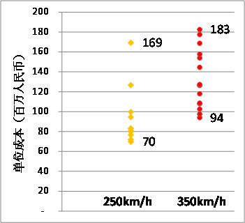 對2013年末27條運行中高鐵建設(shè)成本的分析顯示,各條線路的單位成本差異很大。設(shè)計時速350 公里的線路單位成本為每公里9400萬至1.83億元。設(shè)計時速250 公里的客運專線(個別除外)的單位成本為每公里7000萬至1.69億元。加權(quán)平均單位成本(包括工程籌備、土地、土建工程、軌道工程、車站工程[但只含部分大車站],四電工程,機車車輛,維修場站,以及建設(shè)期利息等成本):時速350 公里的項目為1.29億元/公里;時速250 公里 的項目為0.87億元/公里。