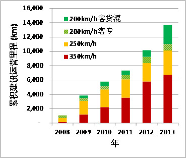 世界銀行的報告按照國際通行標(biāo)準(zhǔn),將高鐵定義為最大速度為250 公里/小時及以上的鐵路。按此定義,中國的高鐵項目始于2003年,首條高鐵為秦皇島與沈陽之間404 公里的線路,最高時速為250 公里。2008年8月,北京至天津的高鐵開始營運,成為首條時速350 公里的新一代高鐵。截至2013年12月末,設(shè)計時速為200 公里及以上的鐵路已貫穿或即將貫穿中國的大部分都市區(qū)。