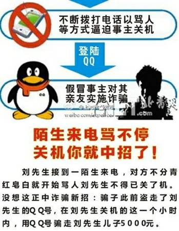 騙招八:陌生來電罵不停很可能是騙局 假如一陌生人來電,對方不分青紅皂白就開罵,這時候,千萬別關(guān)手機,把對方設(shè)為黑名單即可。因為這是騙子的詐騙新招,騙子同過來電辱罵不停,令對方反感進而關(guān)機,這是為了盜走受騙者 QQ 號,對其親友進行敲詐行騙。 該文章在 2014/7/25 15:46:35 編輯過 |
