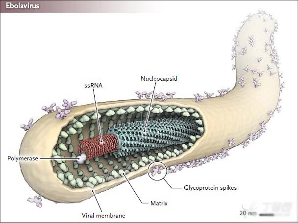埃博拉病毒兇險(xiǎn)但并不神秘 埃博拉病毒是引起埃博拉出血熱的病原體。人在感染埃博拉病毒后,臨床表現(xiàn)主要為突起發(fā)熱、出血和多臟器損害,病死率高達(dá)50%—90%。 在美國(guó)疾病預(yù)防控制中心病毒學(xué)家麥科明克和她的妻子合著的紀(jì)實(shí)小說(shuō)《第四級(jí)病毒》里,有一段文字描述了埃博拉病毒感染者的真實(shí)場(chǎng)景:昏暗的煤油燈光下只見(jiàn)十來(lái)個(gè)病人躺在草席上,有的痛得打滾,徒勞無(wú)功地和一口一口吞噬他們身體的病毒奮戰(zhàn);有的身體僵硬,喉間嘎嘎作響,死亡離他們不遠(yuǎn)。經(jīng)過(guò)5天的潛伏期加上病發(fā)2—3天,埃博拉病毒感染者的喉部就會(huì)嚴(yán)重發(fā)腫,連口水都無(wú)法吞咽。埃博拉病毒感染速度快且致命,病癥包括鼻子、牙床出血,有時(shí)其他部位也會(huì)大量出血。大部分病人在數(shù)天內(nèi)死亡,所有治療方法都無(wú)效。 正是由于埃博拉病毒具有極高的致死率,且患者死狀慘烈,很多描述恐怖病毒大流行的電影、電視作品都喜歡以該病毒作為題材,這為埃博拉病毒披上了一層神秘的面紗。 在電子顯微鏡下,埃博拉病毒呈現(xiàn)出纖絲狀。這些纖絲或彎曲或纏繞,形似蠕蟲(chóng)糾結(jié)在一起。但在楊瑞馥看來(lái),這些糾纏在一起的纖絲狀病毒雖然兇險(xiǎn),卻并不神秘。
