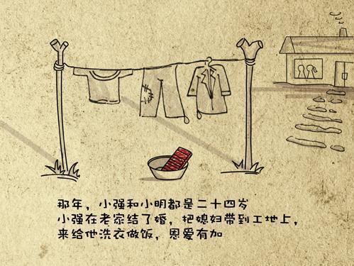 小強(qiáng)在老家結(jié)了婚,把媳婦帶到工地上,來給他洗衣做飯,恩愛有加。