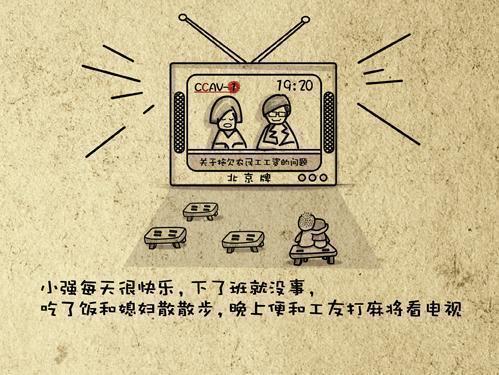 小強(qiáng)每天很快樂,下了班就沒事,吃了飯和媳婦散散步,晚上便和工友打麻將看電視。