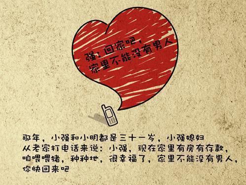 那年,小強(qiáng)和小明都是三十一歲。小強(qiáng)媳婦從老家打電話來說:小強(qiáng),現(xiàn)在家里有房有存款,咱喂喂豬,種種地,很幸福了,家里不能沒有男人,你快回來吧。