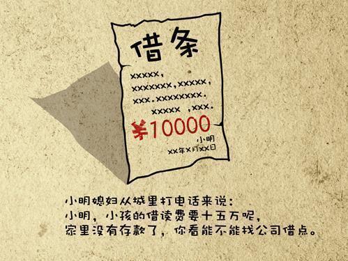 小明媳婦從城里打電話來說:小明,小孩的借讀費(fèi)要十五萬呢,家里沒有存款了,你看能不能找公司借點(diǎn)。