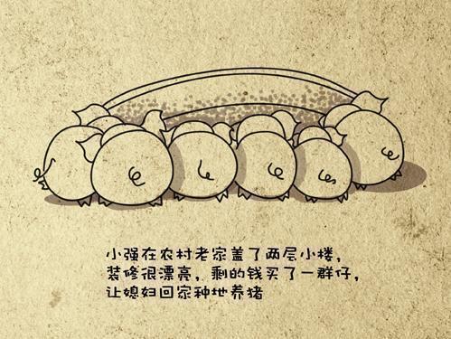 小強(qiáng)在農(nóng)村老家蓋了兩層小樓,裝修很漂亮,剩的錢買了一群仔,讓媳婦回家種地養(yǎng)豬。