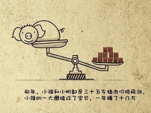 那年,小強(qiáng)和小明都是三十五歲。豬肉價格瘋漲,小強(qiáng)的一大圈豬成了寶貝,一年賺了十幾萬。