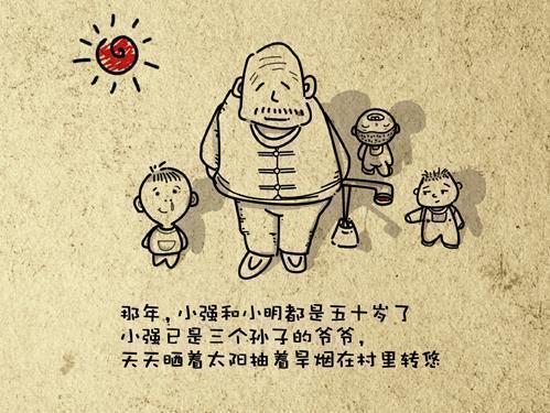那年,小強(qiáng)和小明都是五十歲了。小強(qiáng)已是三個孫子的爺爺,天天曬著太陽、抽著旱煙,在村里轉(zhuǎn)悠。