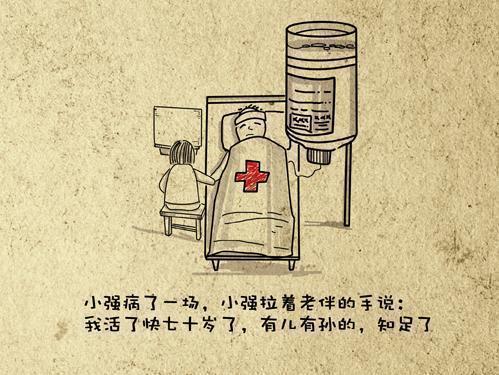 小強(qiáng)病了一場,小強(qiáng)拉著老伴的手說:我活了快七十歲了,有兒有孫的,知足了。