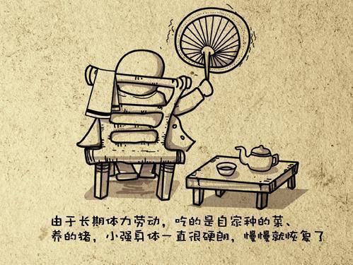 由于長期的體力勞動,吃的是自家種的菜、養(yǎng)的豬,小強(qiáng)的身體一直都很硬朗,慢慢的就恢復(fù)了。