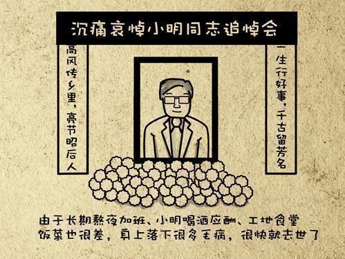 由于長期的熬夜加班,小明喝酒應(yīng)酬、工地食堂飯菜也很差,身上落下很多毛病,很快就去世了。