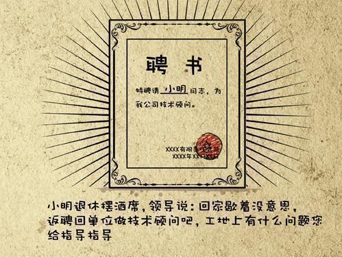 小明退休擺酒席,領(lǐng)導(dǎo)說:回家歇著沒意思,返聘回單位做技術(shù)顧問吧,工地上有什么問題,您給指導(dǎo)指導(dǎo)。
