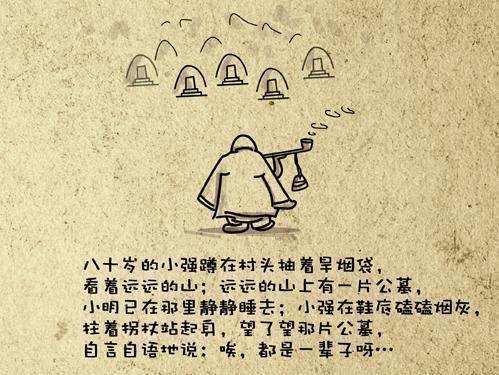 八十歲的小強(qiáng)蹲在村頭抽著旱煙袋,看著遠(yuǎn)遠(yuǎn)的山;遠(yuǎn)遠(yuǎn)的山上有一片公墓,小明已在那里靜靜睡去;小強(qiáng)在鞋底磕磕煙灰,拄著拐杖站起身,望了望那片公墓,自言自語地說:唉,都是一輩子呀……