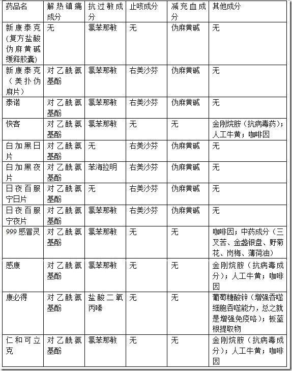 另外,兒童用藥時(shí)應(yīng)當(dāng)盡量選用兒童專用的藥品,或是仔細(xì)閱讀說(shuō)明書(shū)中關(guān)于兒童用法的說(shuō)明。在沒(méi)有了解清楚兒童用法和用量時(shí)直接給兒童使用成人的藥物(不僅指感冒藥)是有很大風(fēng)險(xiǎn)的。 最后還想提一點(diǎn),那就是過(guò)敏的問(wèn)題。上面提到的藥物都可能引起過(guò)敏,連抗過(guò)敏藥也不例外。如果在用藥過(guò)程中發(fā)現(xiàn)說(shuō)明書(shū)中沒(méi)有說(shuō)明的、異常的不適癥狀,有可能是由藥物過(guò)敏造成的,這時(shí)應(yīng)停藥并到醫(yī)院就診。 最后奉上常見(jiàn)感冒藥成分表,祝大家健康~~