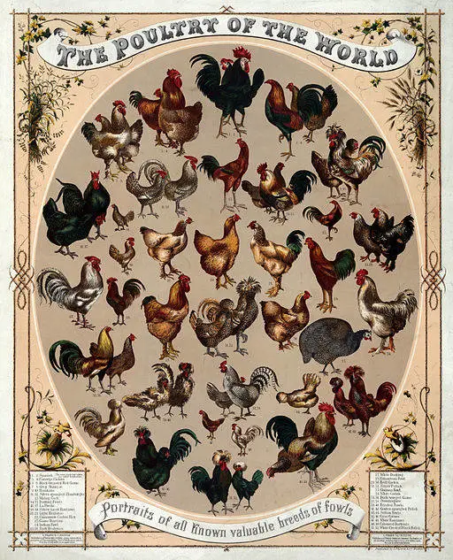 世界上 30 種有名有姓的雞,Chromolithograph by L. Prang & Co., Boston(Public Domain) 馴化雞的宗譜跟英國(guó)都鐸王室的宗譜一樣復(fù)雜,最早可以追溯至7,000到10,000年之前。不僅如此,據(jù)最新研究成果,它至少擁有兩個(gè)野生始祖并可能有過不止一次被馴化的經(jīng)歷。在中國(guó)東北,人們發(fā)現(xiàn)了迄今為止最古老的疑似雞化石,其年代大約在公元前5400年。但鳥類的始祖從來沒有在寒冷、干燥的平原上生活過,因此,如果它們確實(shí)屬于雞骨化石,一定是來自別的地方,很可能是東南亞。雞的始祖是紅原雞。查爾斯?達(dá)爾文首先提出了這種理論,而這個(gè)假說最近通過DNA檢測(cè)分析得到了證實(shí)。紅原雞與現(xiàn)代家雞的相似之處表現(xiàn)在公雞的紅色垂肉和雞冠、用來戰(zhàn)斗的距以及交配時(shí)的喔喔鳴叫聲。暗褐色的母雞跟家雞在孵蛋和咯咯叫上沒什么兩樣。在它們的生活地,從印度東北部到菲律賓,紅原雞都是徜徉在森林中,尋找地上的昆蟲、種籽和果實(shí),晚上飛到樹上的雞窩休息。它的全部飛翔能力僅此而已,這種飛不遠(yuǎn)的特點(diǎn)對(duì)于想要抓住并飼養(yǎng)它們的人類來說,真是求之不得。這個(gè)特點(diǎn)也在后來讓雞與非洲人交上了朋友,不過他們本地的珍珠雞有個(gè)讓人反感的毛病,時(shí)常發(fā)神經(jīng),會(huì)往森林里飛。 但是紅原雞并不是現(xiàn)代雞唯一的始祖??茖W(xué)家們已經(jīng)識(shí)別出了3種可能與紅原雞交配混血的種類。但是,人們還不能確定,其它鳥類到底貢獻(xiàn)了多少遺傳物質(zhì)給馴養(yǎng)雞。最新研究結(jié)果表明,現(xiàn)代雞繼承了至少一種特征,即它們黃色的皮膚,源自印度南方的灰原雞。被馴養(yǎng)的紅原雞,真的以東南亞為起點(diǎn),向北進(jìn)軍中國(guó)或者向西南進(jìn)入印度嗎?還是存在兩個(gè)彼此獨(dú)立的馴養(yǎng)中心:古代印度和東南亞??jī)煞N情形都有可能,但不連貫的基因鏈阻礙了進(jìn)一步追蹤雞的身世的努力?!耙?yàn)榧译u和野雞在漫長(zhǎng)的進(jìn)化史上反復(fù)雜交,這使得追蹤基因鏈變得很困難,”麻省理工-哈佛布羅德研究所的計(jì)算生物學(xué)家邁克爾?鄒迪說。 2004年,雞迎來了最輝煌的時(shí)刻。由遺傳學(xué)者組成的一個(gè)國(guó)際小組繪制出了完整的雞基因組圖譜。據(jù)此可以認(rèn)定雞的顯赫身世:世界上第一種馴養(yǎng)動(dòng)物、第一種鳥類動(dòng)物,也就是說是恐龍的直系后代。這個(gè)基因組圖譜為我們提供了一個(gè)極佳的機(jī)會(huì),可以研究歷經(jīng)數(shù)千年的馴養(yǎng)會(huì)對(duì)一個(gè)物種造成哪些改變。在一個(gè)由瑞典烏普薩拉大學(xué)牽頭的研究項(xiàng)目中,鄒迪及其同事一直在研究紅原雞和它們的家雞子孫之間的差異,后者包括專門培育的“蛋雞”和“肉雞”。研究人員發(fā)現(xiàn),有個(gè)編號(hào)TBC1D1的基因發(fā)生重要突變,它負(fù)責(zé)調(diào)節(jié)糖代謝。在人類基因組中,這個(gè)基因的突變與肥胖癥有關(guān),既然雞注定是要上餐桌的,能多長(zhǎng)肉才是硬道理。他們還發(fā)現(xiàn),選擇性繁殖造成了TSHR基因突變。這個(gè)基因協(xié)調(diào)野生動(dòng)物的單日生殖活動(dòng),將繁衍后代局限在特定季節(jié)。然而基因突變損害了這種功能,于是雞可以常年繁育——下蛋不止。 野雞變成家雞之后的數(shù)千年間,人類的文化交流、貿(mào)易、移居和征伐等活動(dòng)也促進(jìn)了雞在全世界不同地區(qū)之間不斷地被引進(jìn)、再引進(jìn)。雖然目前還不確定,但有證據(jù)表明印度河谷可能是鳥類西遷的出發(fā)點(diǎn),在4000年前的哈拉帕文明時(shí)期,這里的一些城邦與中東之間的貿(mào)易活動(dòng)非常興盛??脊艑W(xué)家們?cè)诹_塔爾發(fā)掘出了雞骨頭,這里曾是古代印度西部海岸的重要港口,人們由此不禁想到一種可能性:不管是作為被販賣的活物還是海員們果腹的美食,從那時(shí)起,雞就開始遠(yuǎn)渡重洋造訪了阿拉伯半島。到了公元前2000年,美索不達(dá)米亞的楔形文字曾有“麥路哈的鳥”的字樣,也許說的就是印度河谷某處。但它說的未必是雞;作為哈佛大學(xué)的古代近東文字專家,彼得?斯坦凱勒教授說,可以確定它指的是“美索不達(dá)米亞未知的異域鳥?!彼嘈?00年后出現(xiàn)在文字中的“麥路哈皇家的鳥”很可能說的就是雞。 大約過了250年,作為具有異國(guó)風(fēng)情的戰(zhàn)斗雞和籠中鳥,雞來到了埃及。王室陵墓開始出現(xiàn)以雞為主角的裝飾品。又過了1000年,雞進(jìn)入了尋常百姓家,成了埃及人買賣的商品。就在那個(gè)時(shí)代,埃及人掌握了人工孵化的技術(shù),從此母雞們可以從抱窩中解放出來,去做更有意義的事:多多下蛋。說起來,這可是一件大事。大多數(shù)雞蛋孵出小雞需要3周的時(shí)間,但它們到時(shí)間能否順利破殼而出,還要看孵蛋的溫度能不能保持在華氏99至105度之間,而且相對(duì)濕度必須在55%上下,臨近孵出那幾天逐漸提高。每天還要給雞蛋翻身3至5次,不然孵出的小雞可能就會(huì)缺翅少腿。 埃及人建起了由數(shù)百個(gè)“烤箱”構(gòu)成的大型孵化設(shè)施??鞠?,或者說孵化室面積很大,與四通八達(dá)的走廊和煙道相互連接,借助這種方式,孵蛋人可以調(diào)節(jié)孵化室里的溫度,用來供暖的