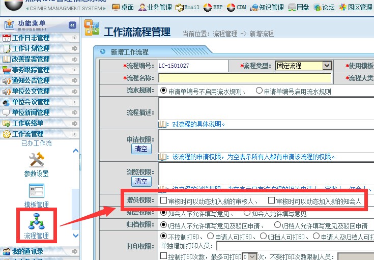 在工作流流程設(shè)計(jì)時(shí),勾選“審核時(shí)可以動(dòng)態(tài)增加新的審核人”,默認(rèn)這個(gè)功能是不啟用的: