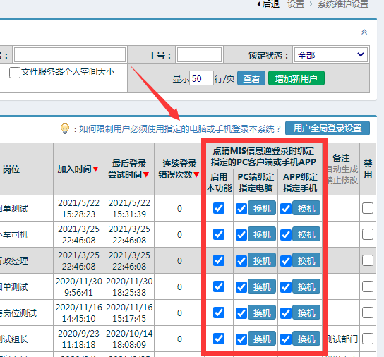 3、該用戶如果需要更換其他的電腦或手機登錄到OA,必須向管理員提出申請,管理員在以上位置點擊“換機”按鈕,就會自動顯示為“換機中”。此時,該用戶有一次機會更換登錄電腦或手機,該用戶用新的電腦或手機登錄點晴MIS信息通PC客戶端或手機APP后,系統(tǒng)就會自動綁定到新的電腦或手機上,舊的電腦或手機將禁止該用戶登錄到點晴OA。