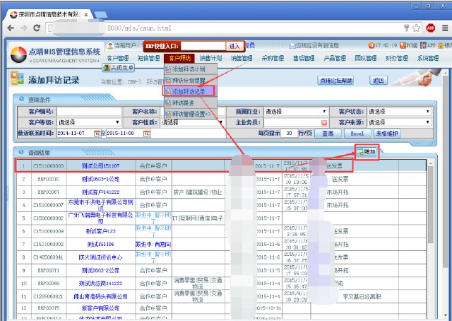 操作步驟:客戶拜訪——添加拜訪記錄——選擇拜訪的客戶——點(diǎn)擊“增加”;如下圖所示: