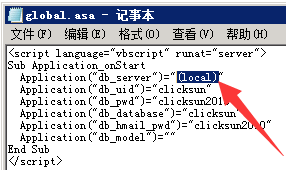 如果上面采用用戶名sa可以正常登陸進(jìn)入SQL Server數(shù)據(jù)庫(kù),但還是無(wú)法登陸點(diǎn)晴OA,那么就應(yīng)該是點(diǎn)晴OA根目錄下文件global.asa中數(shù)據(jù)庫(kù)訪問的用戶名 和/或 密碼有誤,必須確保該文件中用戶名和密碼與上面這個(gè)無(wú)誤。用記事本程序打開文件D:\clicksun\global.asa,找到本數(shù)據(jù)庫(kù)實(shí)例名稱、用戶名、密碼填入重試:
