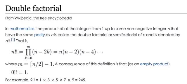 但是在數(shù)學(xué)領(lǐng)域里,兩個(gè)嘆號(hào)連一起是有名詞解釋的,這叫做“雙階乘”,來(lái)看維基百科里的解釋。