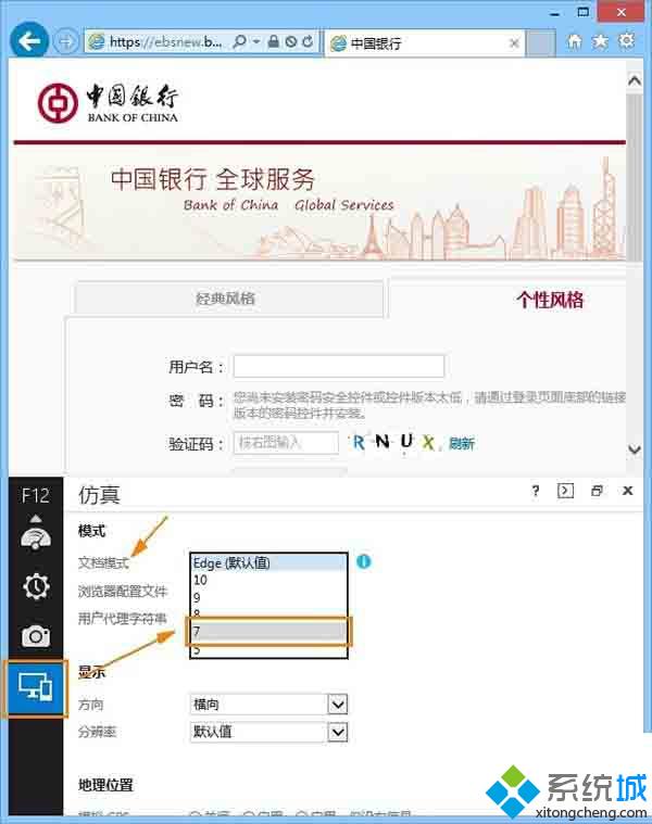 錯誤顯示:您尚未安裝密碼安全控件或控件版本太低,請通過登錄頁面底部的鏈接下載最新版本的密碼控件并安裝。 原因分析:這種情況主要是由于兼容性導(dǎo)致的,我們可以嘗試使用IE11的兼容模式打開該網(wǎng)頁。 解決方法: 1、首先在IE11中按下F12鍵打開"開發(fā)人員工具",將左邊的菜單切換到最后的"仿真"區(qū)域;然后在"文檔模式"中選擇"7"即可IE兼容性視圖模式;