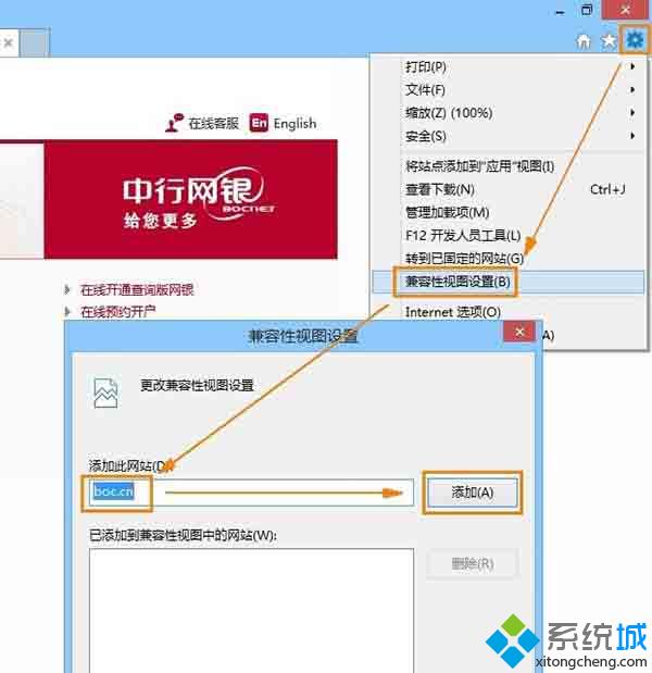 此方法以后每次登陸中國銀行網(wǎng)銀都要先這樣操作一次,那么我們還可以將該網(wǎng)址加入到兼容性視圖列表,就一勞永逸了。具體操作方法如下: 1、點(diǎn)擊IE11右上角的"工具"按鈕,選擇"兼容性視圖設(shè)置"; 2、在打開的窗口中網(wǎng)址欄中會自動填充上網(wǎng)址,單擊"添加"按鈕,關(guān)閉窗口就好了。