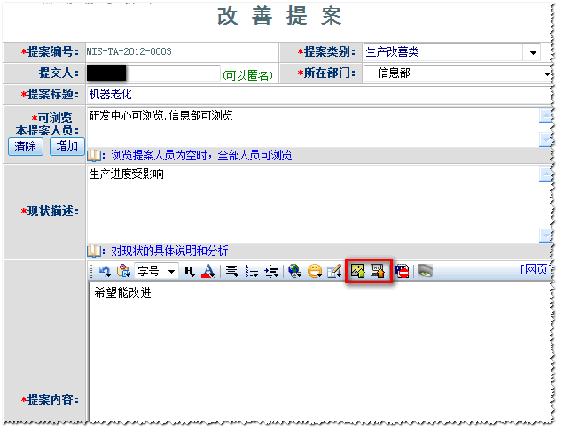 1、提案編號由系統(tǒng)自動(dòng)按照“mis-ta-年-四位流水號”的方式編號,無需人工干預(yù); 2、提案類別可以采用下拉菜單推薦的內(nèi)置內(nèi)別,用戶也可以自行輸入提案類別; 3、提交人:用戶可以以實(shí)名提交提案,也可以匿名或者隨意更換其他姓名提交,普通用戶看到的將是您提交的別名。 特別提醒:您提交的姓名雖然可以和實(shí)名不一樣,但只是針對普通瀏覽用戶而言,系統(tǒng)后臺均特別保存了實(shí)際提交姓名,管理員可以查看到實(shí)際提交人,請您務(wù)必注意自己的言行。 4、所在部門:您所在的部門,請盡量按實(shí)際選擇。 5、現(xiàn)狀描述:目前需要改善的地方的現(xiàn)狀。 6、文本內(nèi)容:最下方文本框內(nèi)可輸入本次提案的詳細(xì)內(nèi)容,可以插入圖片和上傳附件。 該文章在 2016/1/14 17:33:17 編輯過 |