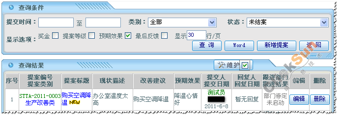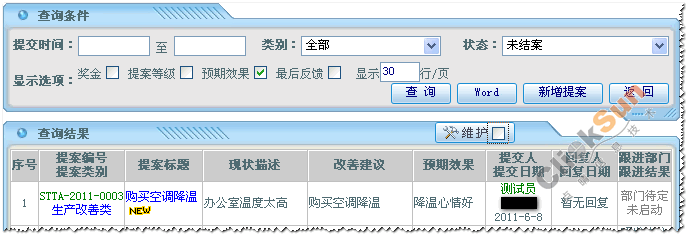 【改善提案】->【提案瀏覽及反饋】,進(jìn)入提案瀏覽窗口用戶可以根據(jù)自己的需要選擇查詢條件、顯示選項(xiàng)、顯示行數(shù)進(jìn)行,然后點(diǎn)擊【查詢】進(jìn)行瀏覽提案。當(dāng)選擇“狀態(tài)”是“未結(jié)案”時(shí),系統(tǒng)會(huì)查詢出未啟動(dòng)、執(zhí)行中或者還未確定狀態(tài)的提案;系統(tǒng)默認(rèn)顯示當(dāng)前用戶有權(quán)限瀏覽的“未結(jié)案”提案。具有編輯全部提案權(quán)限的用...">