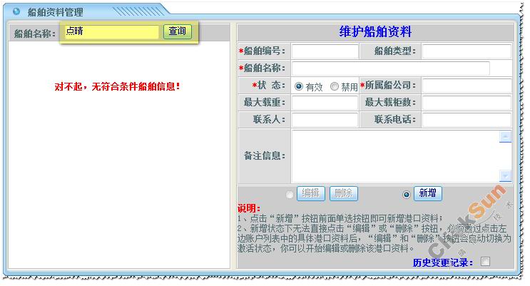 在添加船舶信息之前,請先查找系統(tǒng)上是否已經(jīng)存在相應(yīng)的船舶名稱,再確定是否需要增加船舶信息。如:需添加船舶名為“點(diǎn)晴”,先查找“點(diǎn)晴”,系統(tǒng)顯示找不到相應(yīng)記錄,再進(jìn)行新增船舶信息。