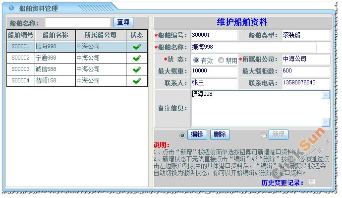 然后,在維護(hù)資料方塊中,錄入船舶編號、名稱、狀態(tài)、所屬公司等詳細(xì)船舶信息,點(diǎn)擊【新增】完成新增船舶資料信息。 2、刪改