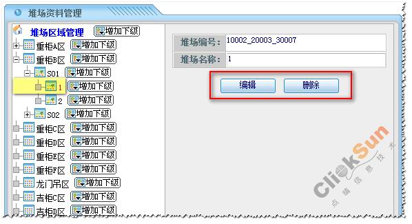 2、刪改: 在堆場信息列表中,先展開堆場信息列表,找到需刪改的堆場信息的所在位置,選中其名稱則右過編輯方塊中顯示了其詳細信息。