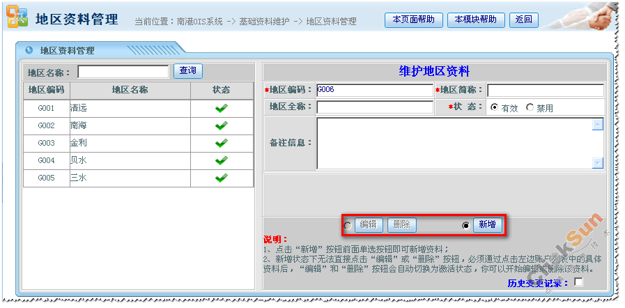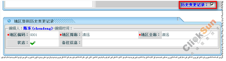 在區(qū)域信息列表中,點(diǎn)取某一區(qū)域名稱(chēng),右邊維護(hù)資料塊則顯示所選取的區(qū)域詳細(xì)信息。 修改區(qū)域的信息,然后點(diǎn)擊【編輯】保存修改信息。 點(diǎn)擊【刪除】刪除所選取的區(qū)域信息。 3、查看歷史變更記錄