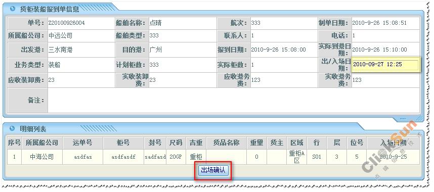 出場(chǎng)信息確認(rèn)完畢后,點(diǎn)擊【出場(chǎng)確定】完成貨柜裝船出場(chǎng)。