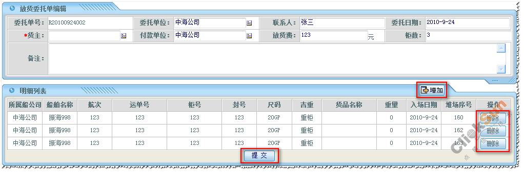 點(diǎn)擊【增加】增加放貨委托單明細(xì)信息。放貨委托單的“柜數(shù)”根據(jù)錄入的明細(xì)行的柜數(shù)進(jìn)行統(tǒng)計,用戶不可手工進(jìn)行修改。